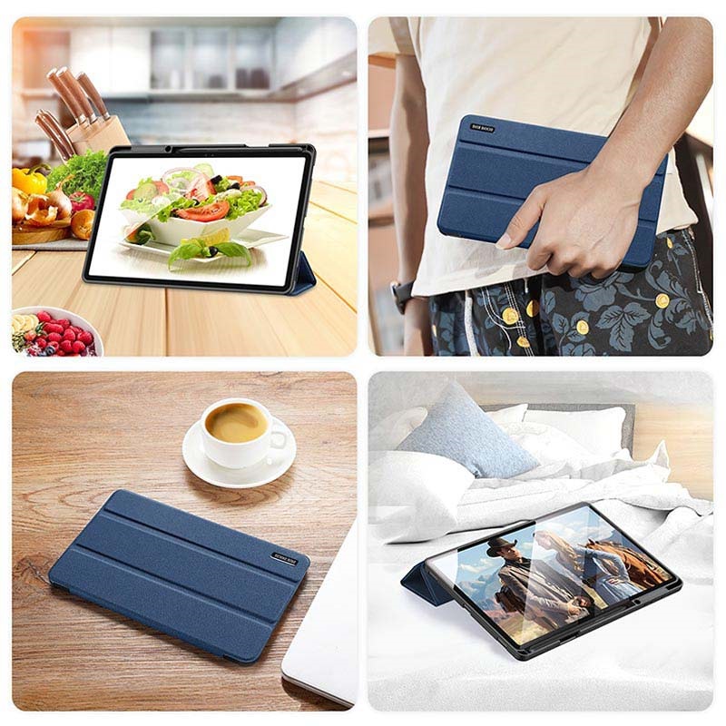 Vyhoďte své Samsung Galaxy Tab S7+, Galaxy Tab S7 Fe v pouzdře Dux Ducis Domo, abyste mu poskytli ochranu a stylový vzhled. Shell s poprvé absorbujícím šok udržuje vaši Samsung Galaxy Tab S7+, Galaxy Tab S7 Fe bezpečný před poškrábáním, promáčknutí a kapky, zatímco přední klapka se skládá do pohodlného stojanu pro psaní nebo sledování médií. Na základě toho funkce inteligentního probuzení/spánku zajišťuje, že ani jedno procento baterie se pustí do plýtvání.