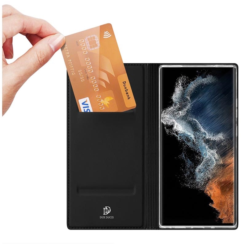 S jedním slotem pro uložení ID nebo kreditní karty. Pouzdro Dux Ducis Skin Pro Flip pro Samsung Galaxy S23 Ultra 5G má také stojan pro hands-free media sledování.