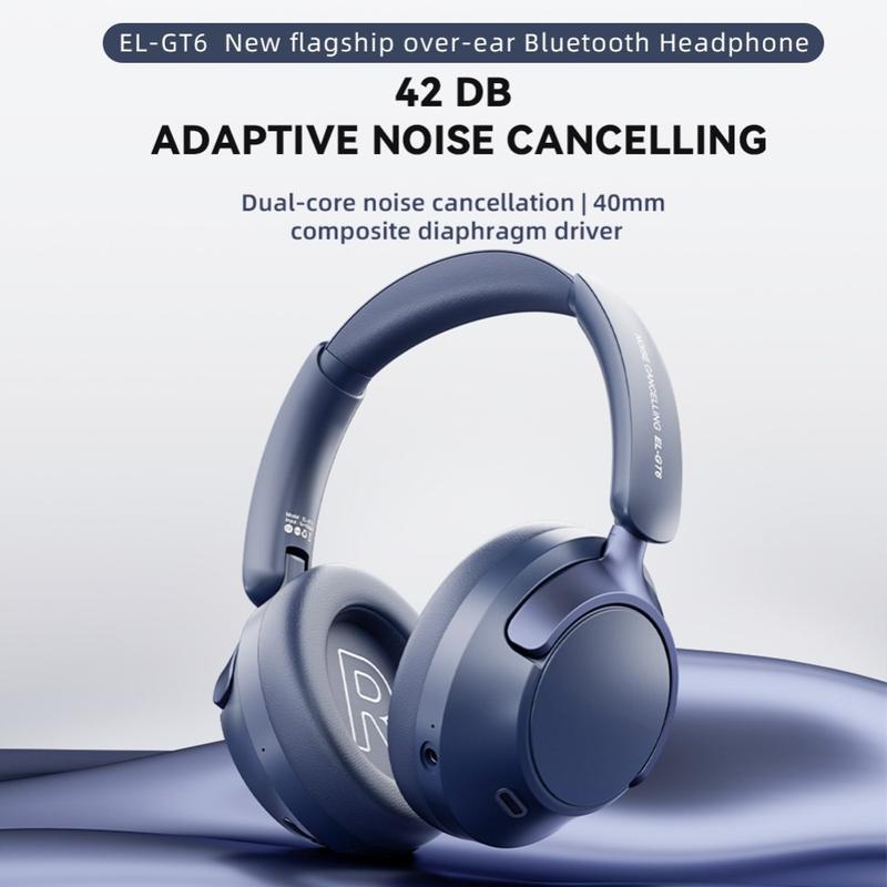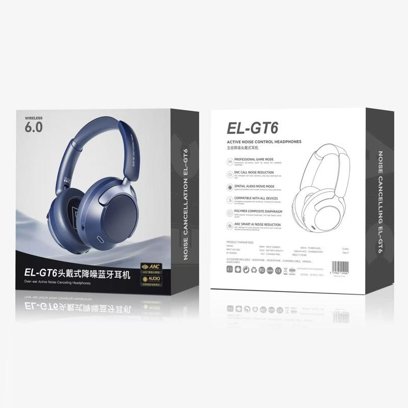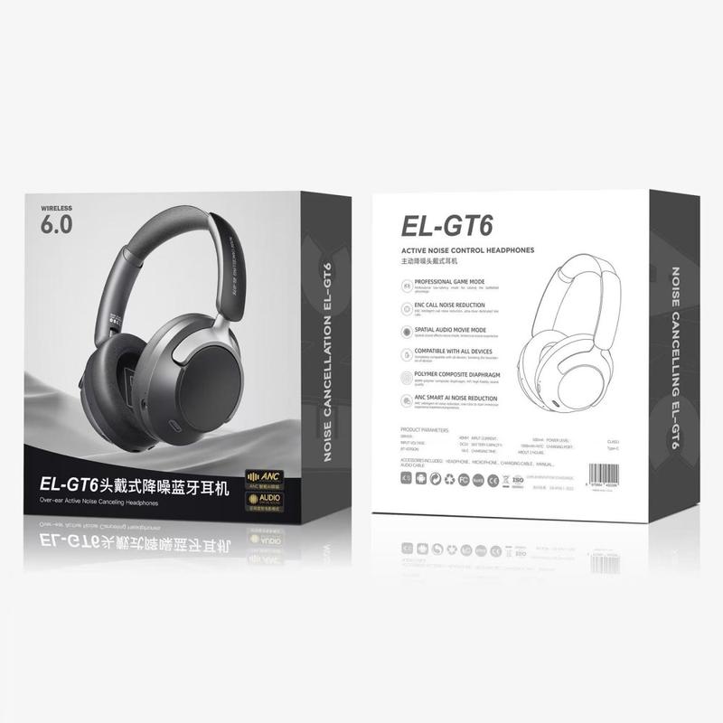 The EL-GT6 ANC noise cancelling wireless headphones delivers immersive audio and long-lasting comfort for gamers, music lovers, and professionals alike. Featuring advanced ANC 3.0 technology with adaptive noise reduction, it blocks out distractions and enhances your listening experience. Equipped with 40mm dynamic drivers and micro-crystal composite diaphragms, it produces deep bass, clear mids, and crisp highs for HiFi sound quality. With Bluetooth 6.0 connectivity, low latency, and up to 120 hours of playtime, this over-ear headset combines performance, comfort, and endurance in one premium package.