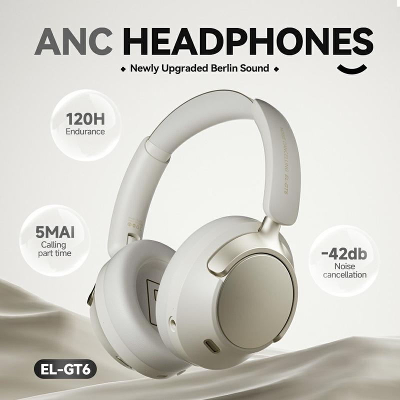 The EL-GT6 ANC noise cancelling wireless headphones delivers immersive audio and long-lasting comfort for gamers, music lovers, and professionals alike. Featuring advanced ANC 3.0 technology with adaptive noise reduction, it blocks out distractions and enhances your listening experience. Equipped with 40mm dynamic drivers and micro-crystal composite diaphragms, it produces deep bass, clear mids, and crisp highs for HiFi sound quality. With Bluetooth 6.0 connectivity, low latency, and up to 120 hours of playtime, this over-ear headset combines performance, comfort, and endurance in one premium package.