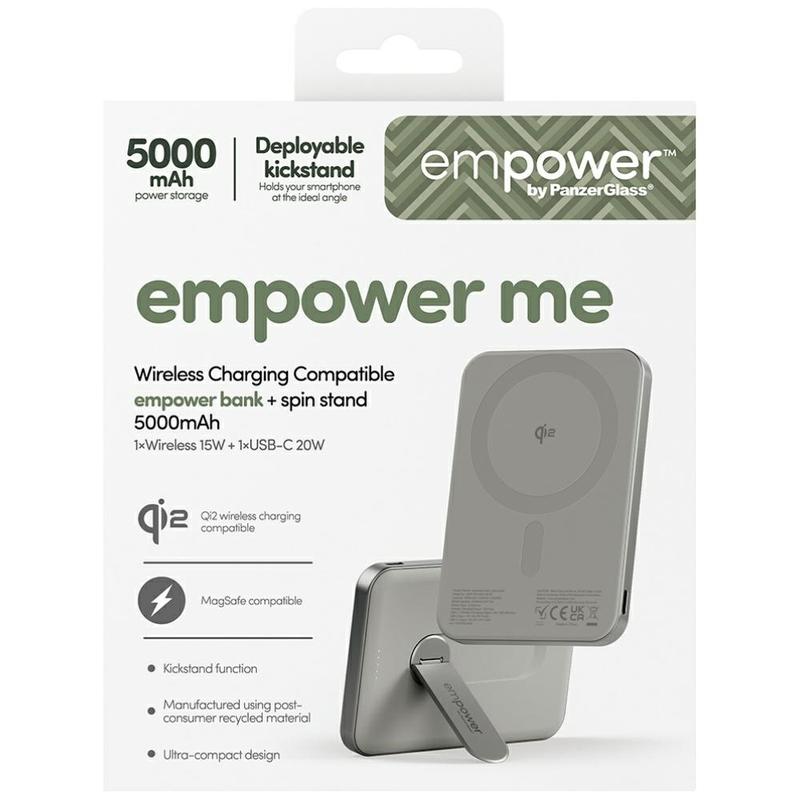 The Empower by PanzerGlass Empower Bank with Spin Stand is a compact, durable power bank designed for fast, reliable charging wherever you go. Qi2 and MagSafe compatible, it delivers secure magnetic alignment for efficient wireless charging on iPhone 12-16 series and other Qi-enabled devices. With a slim profile, built-in spin stand, and sustainable materials, it’s built for everyday convenience and long-term use.