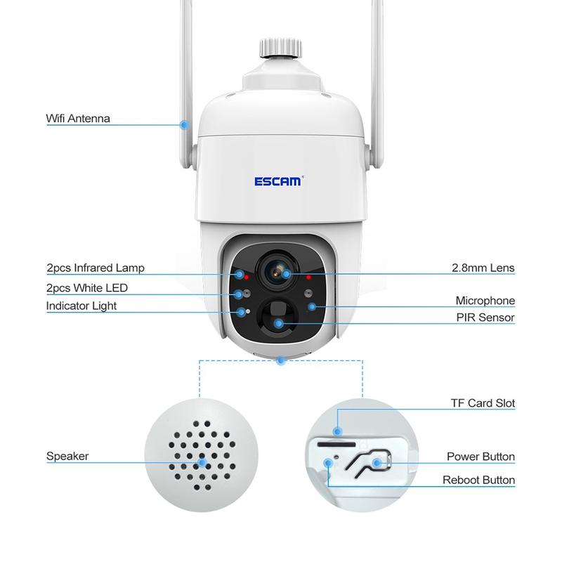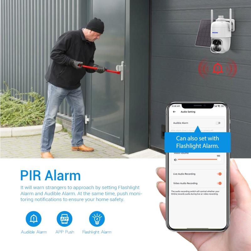 Podpora alarmu PIR, stisknutí zprávy APP, blikání bílého světla a zvukové výstrahy alarmu.