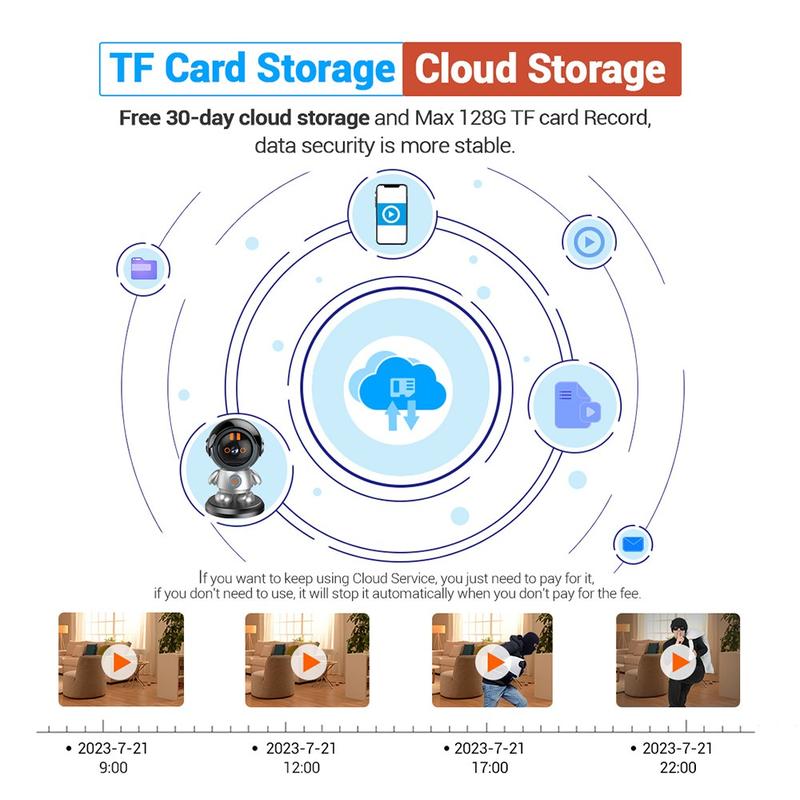 - Storage choices: cloud or microSD up to 128 GB (card not included)