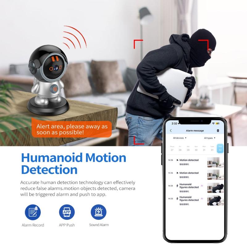 - AI toolkit: humanoid detection, motion zones, auto tracking, sound alarms, app push