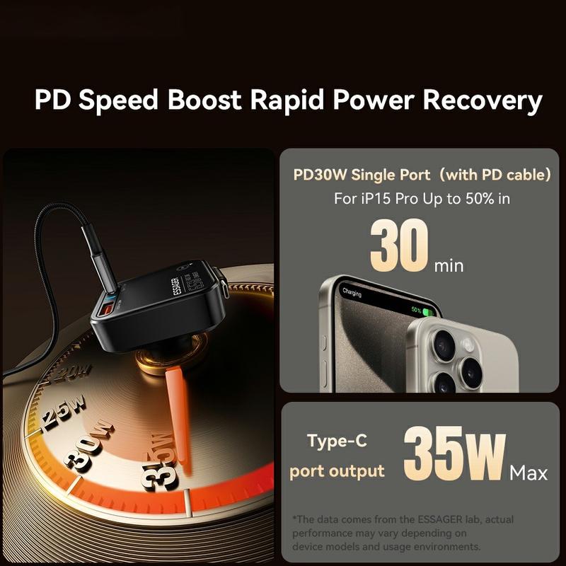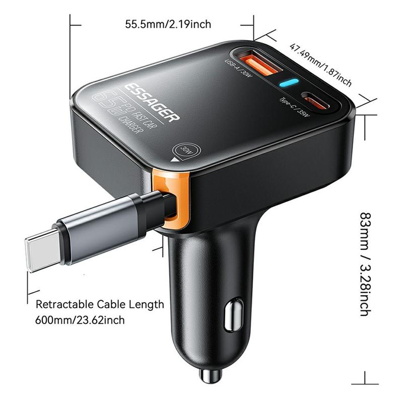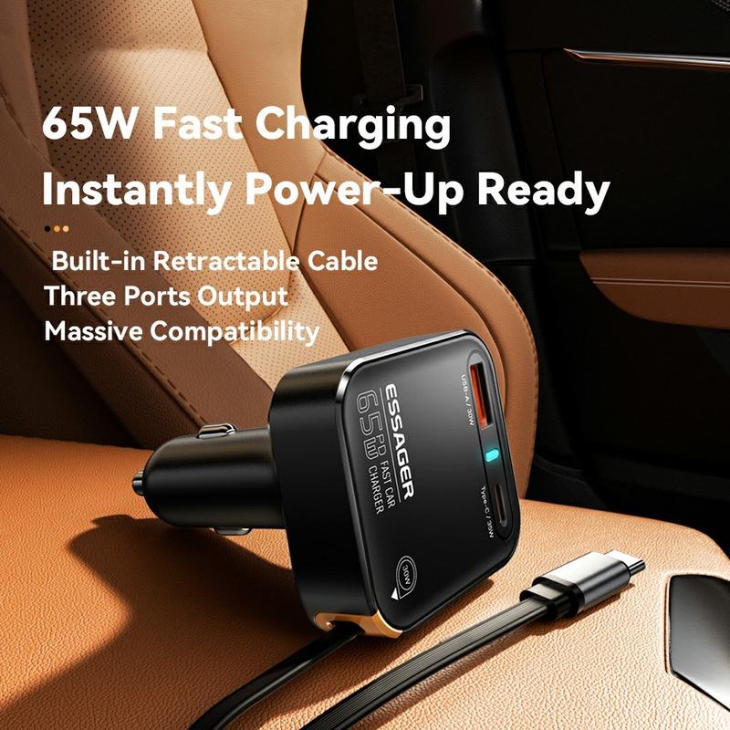 Charge all your devices on the go with the ESSAGER 65W fast charging car charger, designed for speed, convenience, and reliability. Combining powerful output, dual-port versatility, and a built-in retractable cable, this charger ensures a clutter-free and efficient charging experience during every drive.