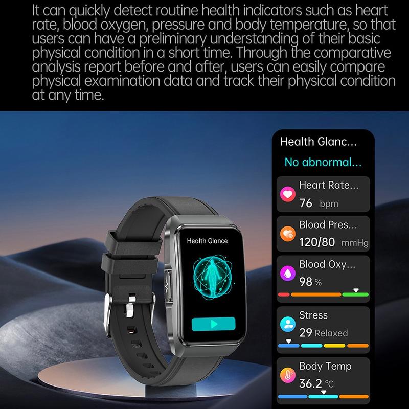 Elevate your everyday routine with the ET650 Smart Watch. Featuring a sleek leather and silicone strap combination, this versatile timepiece offers real-time body temperature monitoring, health tracking, and convenient Bluetooth calls—all within a stylish, durable design. Stay connected and informed wherever you go with a smartwatch made to seamlessly blend form and function.