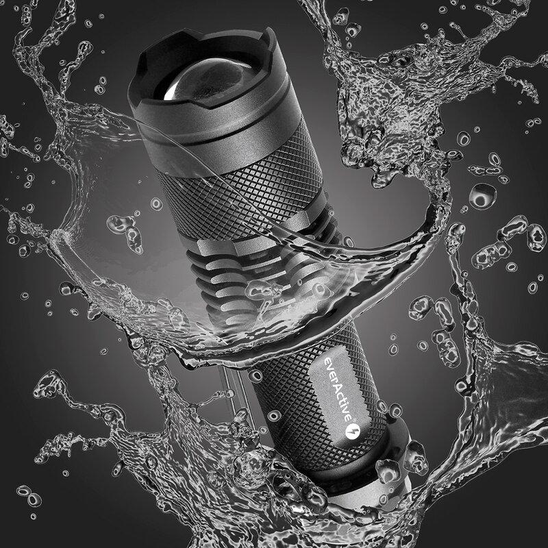 The torch has 3 operating modes: 100%, 25%, flashing, lens generating an even luminous flux and the ability to smoothly adjust the light beam. The FL-180 is powered by a single R6/AA/14500 battery. The Everactive FL-180 flashlight housing is made from durable black-painted aluminum, thanks to the rubber O-rings to withstand weathering. A deeply seated switch on the back of the flashlight allows you to use it as a candle (on a flat surface) in case of power failure. The flashlight is equipped with an additional detachable clip/slide for convenient hooking of the flashlight.