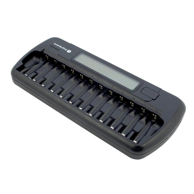 The everActive NC 1200 has as many as 12 independent charging channels for the NI-MH batteries in the sizes R6/AA or R03/AAA, each cell is loaded individually. It allows you to charge 12 R6/AA or R03/AAA rechargeable batteries in any configuration/combination, of any capacity, of any manufacturer.