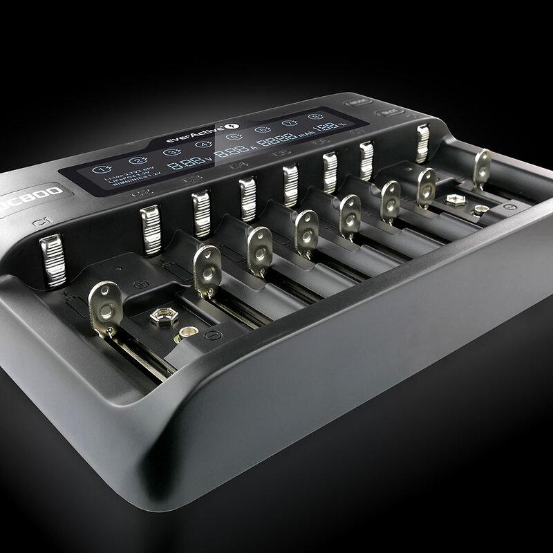EverActive UC800 is a multi-channel, universal charger that has as many as ten independent channels! Eight channels are used to charge cylindrical Ni-MH, Li-ion, Li-HV and Li-FePO4 batteries. The other two channels are used to charge 9V batteries (6F22).