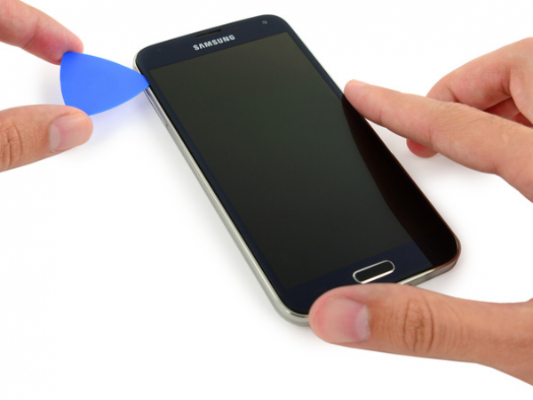 Slide the pick around your phone's corner gently, and stop before the speaker grille, located at the top of the phone.