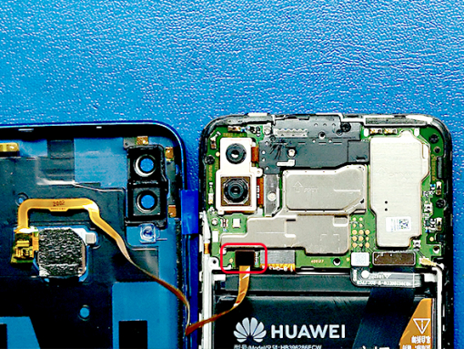 - Use a thin opening tool to separate the back cover from the rest of the phone. - Start from the bottom right corner and go along the edges until all the clips pop off. - Lift the back cover to the left like opening a book. - The fingerprint sensor ribbon cable is attached to the phone right under the camera module. - Do not lift that side of the cover more than 1cm away from the phone.