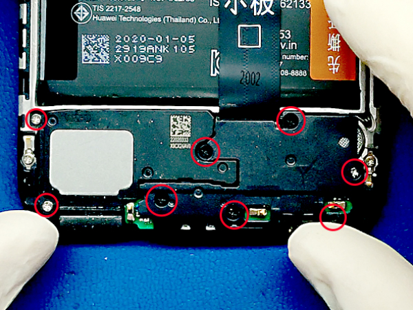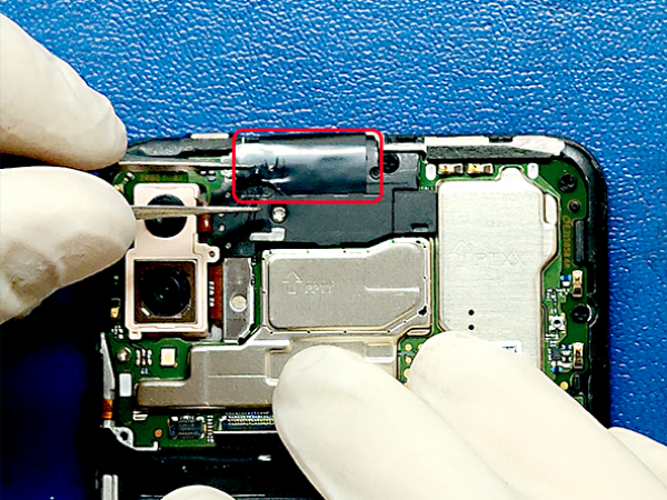 - Remove the black antistatic tape from the top part of the motherboard. - Remove the 7 screws which secure the motherboard and the top bracket. - Remove the bracket that protects the front camera, sensors, and speaker. - Disconnect the antenna. - Unplug and remove the back cameras. - Remove the logic board.