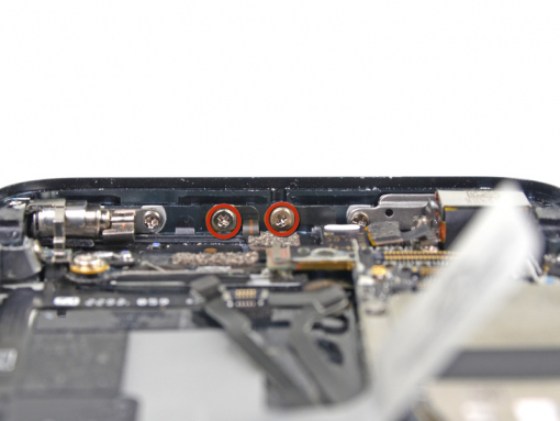 Remove the following two screws attaching the top logic board bracket to the rear case: