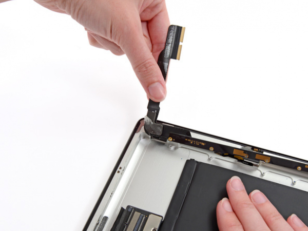 • Peel back the digitizer ribbon cable. Separate the cable from the adhesive securing it to the rear aluminum case with the flat end of a spudger.