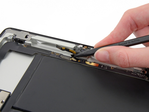 • There's a piece of electrical tape covering the headphone jack assembly cable connector. Use tweezers to peel back the tape and remove it.