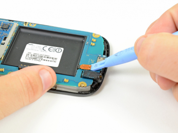 • Insert the flat edge of a plastic opening tool underneath the headphone jack connector and pry upwards.