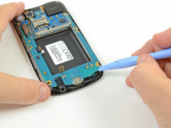 • Wedge the plastic opening tool near the bottom right corner of the motherboard and pry upwards to dislodge it from its recess.