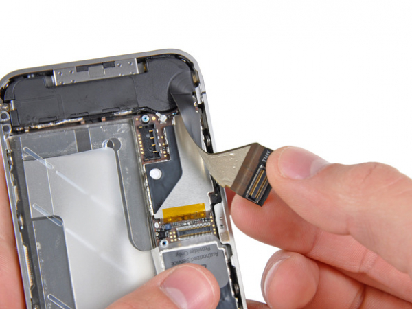 • Now the thin steel dock connector cable cover should be removed from the iPhone.