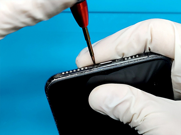 - Remove the SIM card tray. - Remove the two pentalobe screws at the bottom edge of the iPhone. - Apply heat gun or hairdryer to the lower edge of the iPhone for about a minute. - Insert the opening tool between the display and the frame. - Slowly progress along the edges. - Open the iPhone by lifting the display up from the left side, like a book. - Don't try to separete the display yet, several cables is still connected to the phone's logic board. - Opening the phone's display will jeopardize its waterproof features. - Make sure you have prepared replacement seals before you go on with the repair.