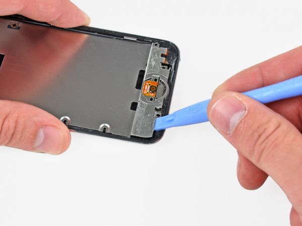 Gently pry (but not remove) the back-facing camera away from the back case, using the edge of the iPod opening tool.