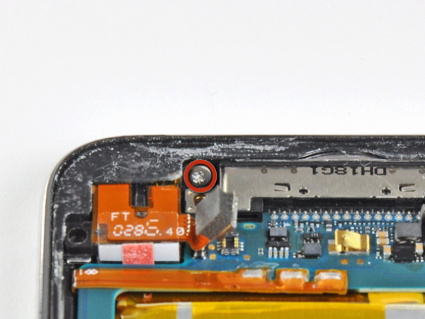 Remove the 2.6 mm Phillips screw securing the headphone jack assembly to the back case.
