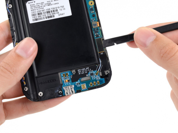 Use a plastic opening tool to lift the battery from the case. You need to insert the tool into the indentation above the battery compartment to do this.