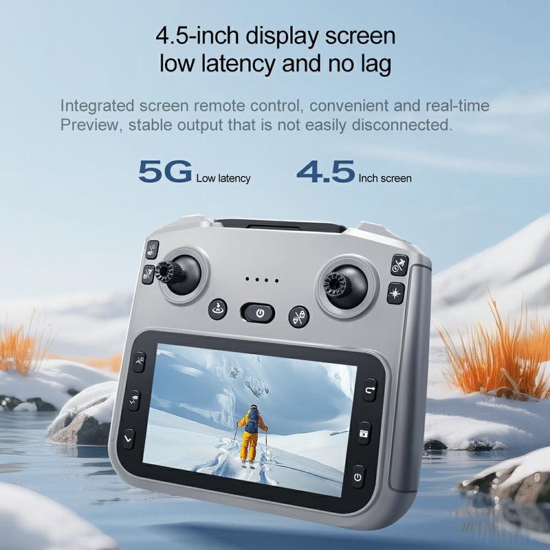 - 5G WiFi FPV transmission provides real-time image viewing directly on the integrated 4.5-inch remote display.