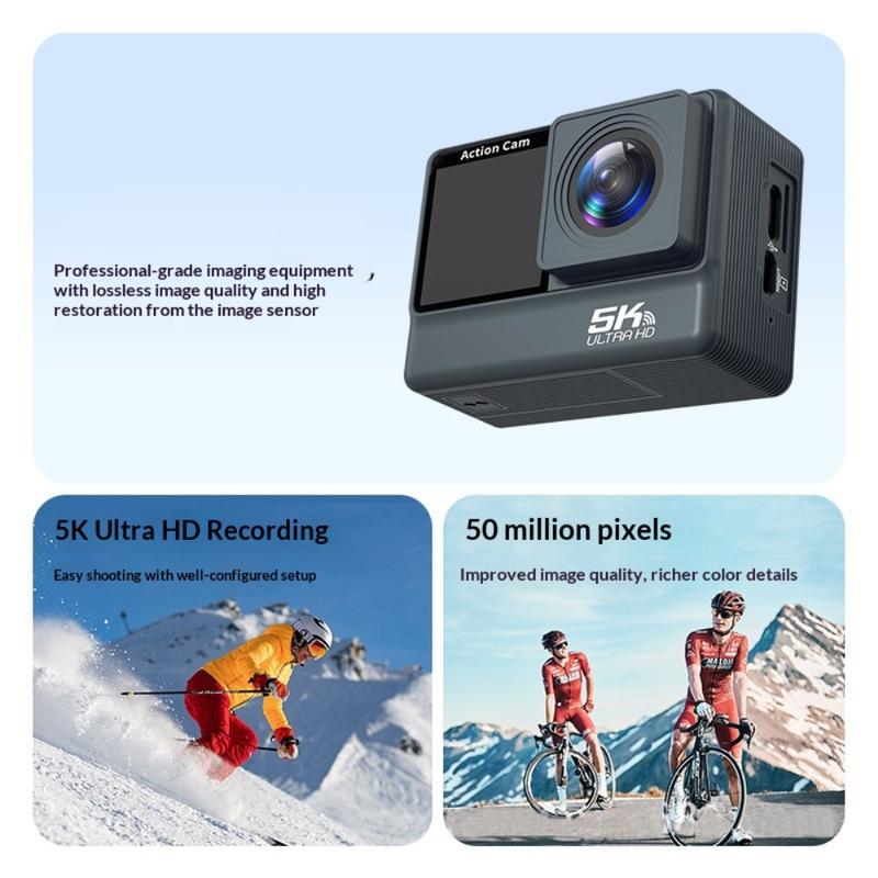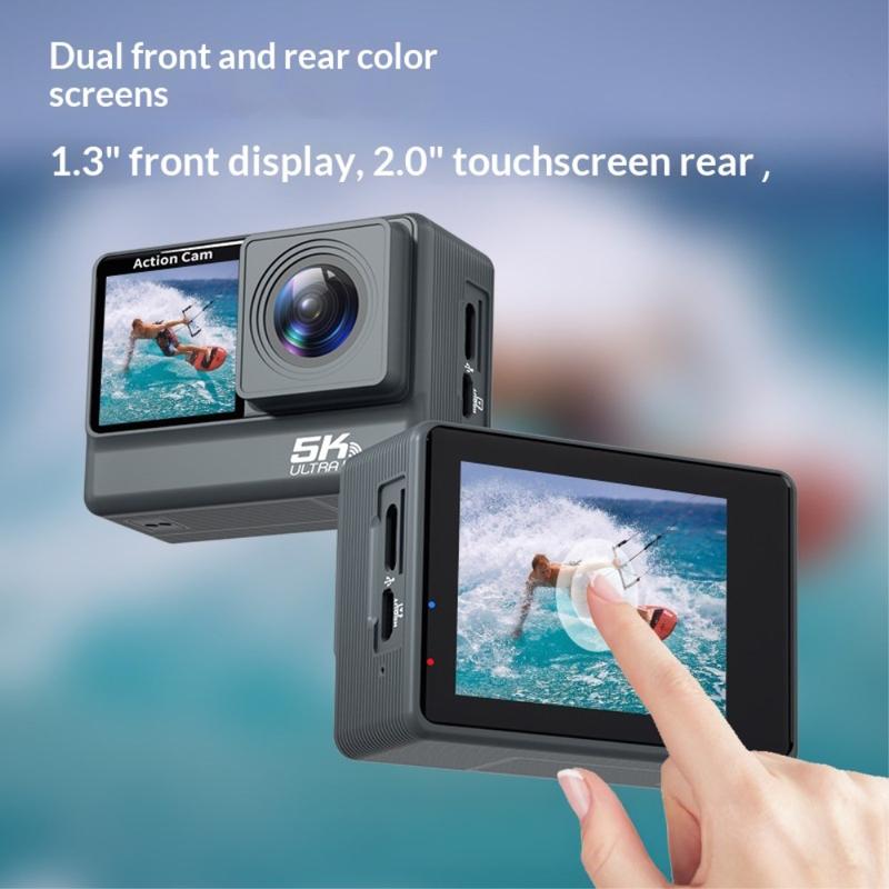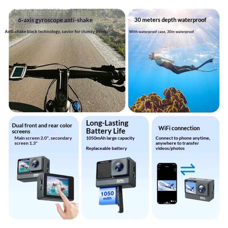F308AATR Dual Screen Action Camera - 5K HD Sports Camera with 6-Axis Stabilization, WiFi and Waterproof Case