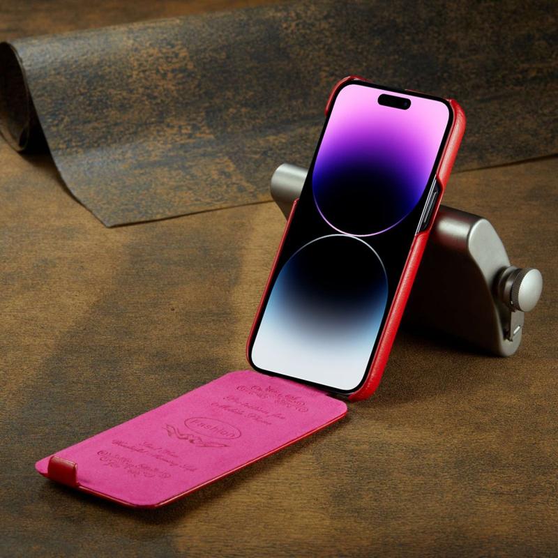 Kožené pouzdro s vertikálně překlápěcím typem crazy horse textury, otevírá se pro snadné ovládání jednou rukou