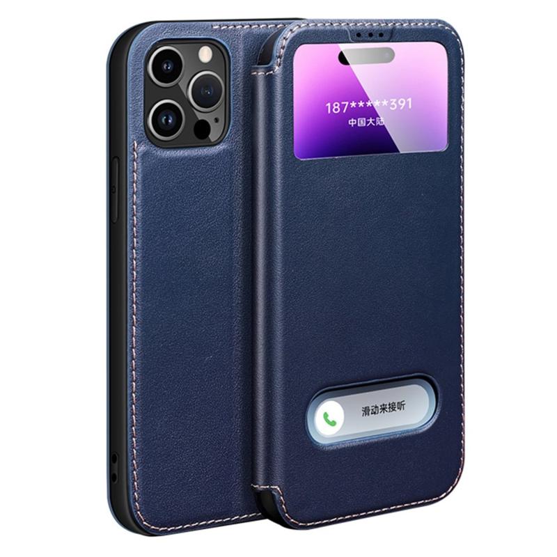 Originální kožené pouzdro z hovězí kůže pro iPhone 14 Pro Max nárazuvzdorný kryt Pouzdro na telefon s dvojitým oknem a stojánkem proti pádu