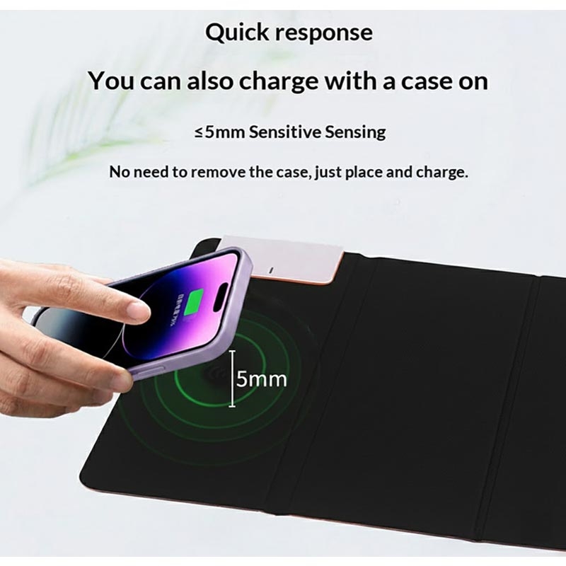The built-in wireless charging module supports up to 15W fast charging, delivering quick and efficient power to compatible smartphones. With ultra-thin sensing technology (≤5 mm), it charges reliably even through most phone cases.