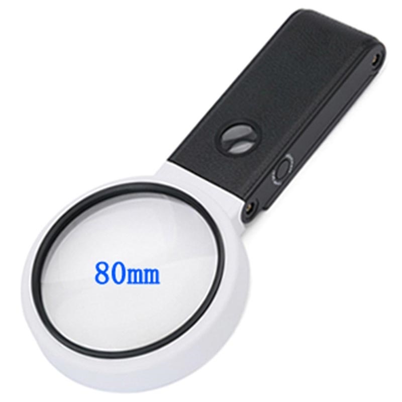 Rest your eyes and use this foldable magnifier to see small objects in better detail, or to see images or text clearer. This magnifying glass is equipped with six LED lights and two UV lights, and it can be used as a handheld or desk magnifying glass.
