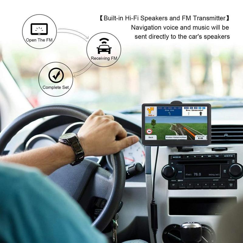 - Full-band FM Transmitter: Output audio from this navigator to your car stereo, FM transmitter (76.0MHz -108MHz) transmits GPS sound to Car, not FM Radio