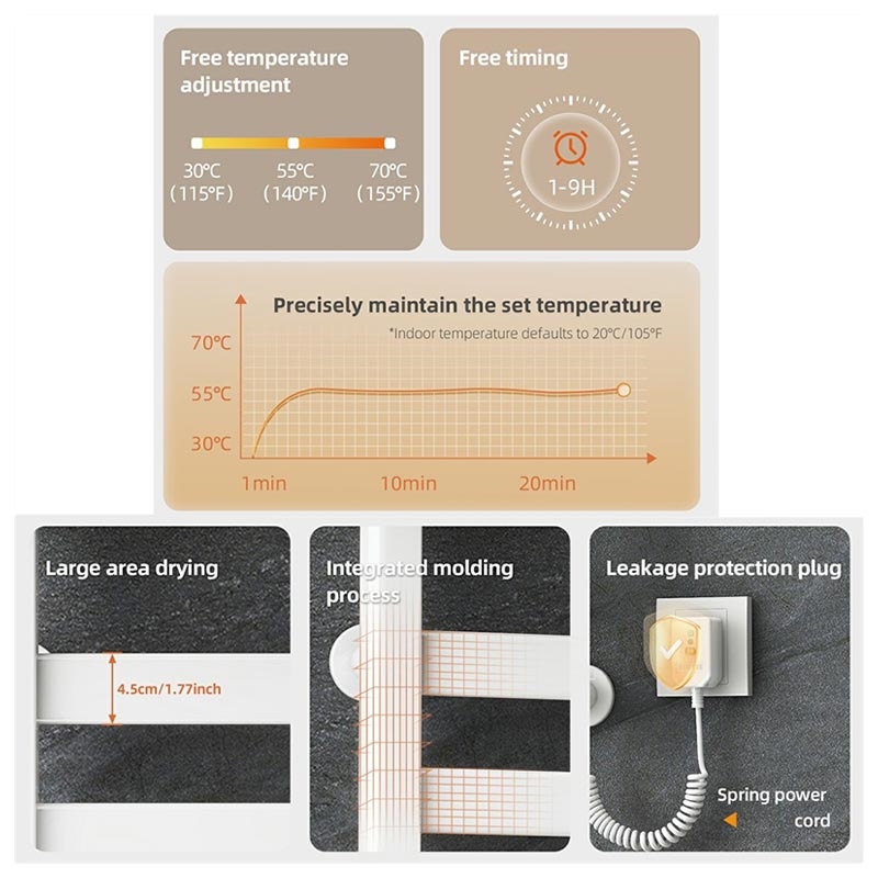 It combines fast heating, precision control, durable construction and modern design — delivering a safe, luxurious and efficient towel-drying experience for any bathroom.
