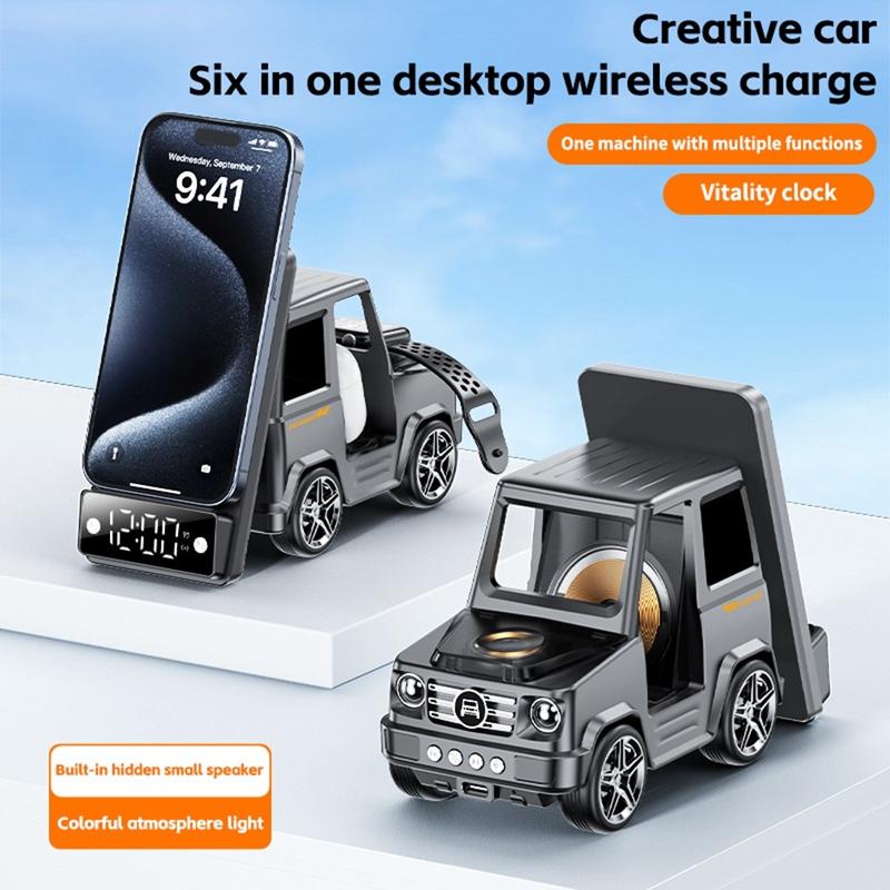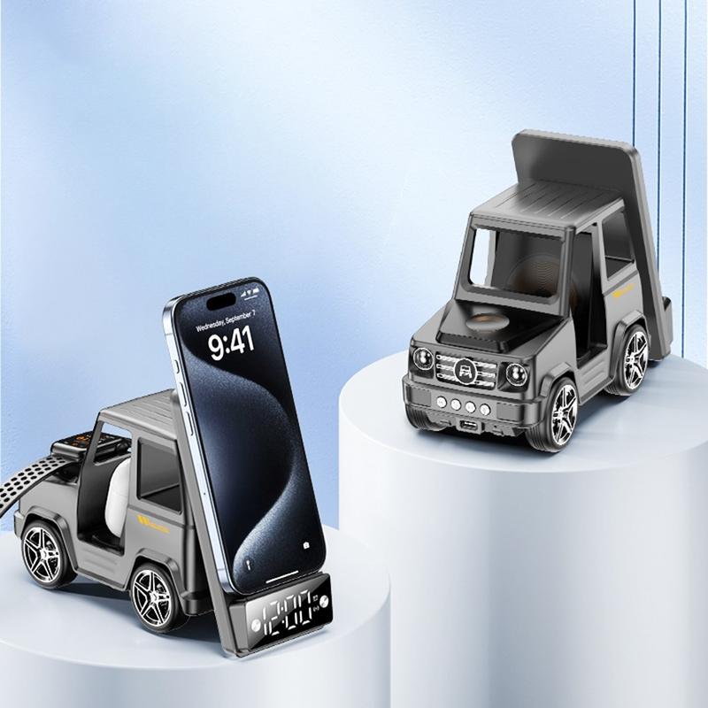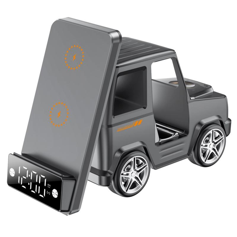 Revolutionize your workspace with the G63 Car-Shaped Wireless Charger. Featuring 15W fast wireless charging, this multifunctional device powers your smartphone, smartwatch, and earbuds simultaneously. The built-in Bluetooth speaker delivers high-quality sound, while the integrated clock with an alarm function helps you stay on schedule. With its unique car design and ambient lighting, it adds a modern touch to your desk or nightstand.