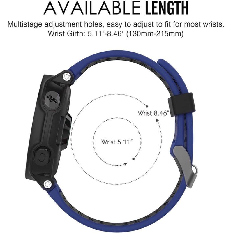 The band is made of soft, flexible, skin-friendly silicone, and it's comfortable for wearing during your all-day activities. The bi-color design of this silicone strap will definitely make your Garmin Forerunner 220/230/235/630/620/735 stand out.