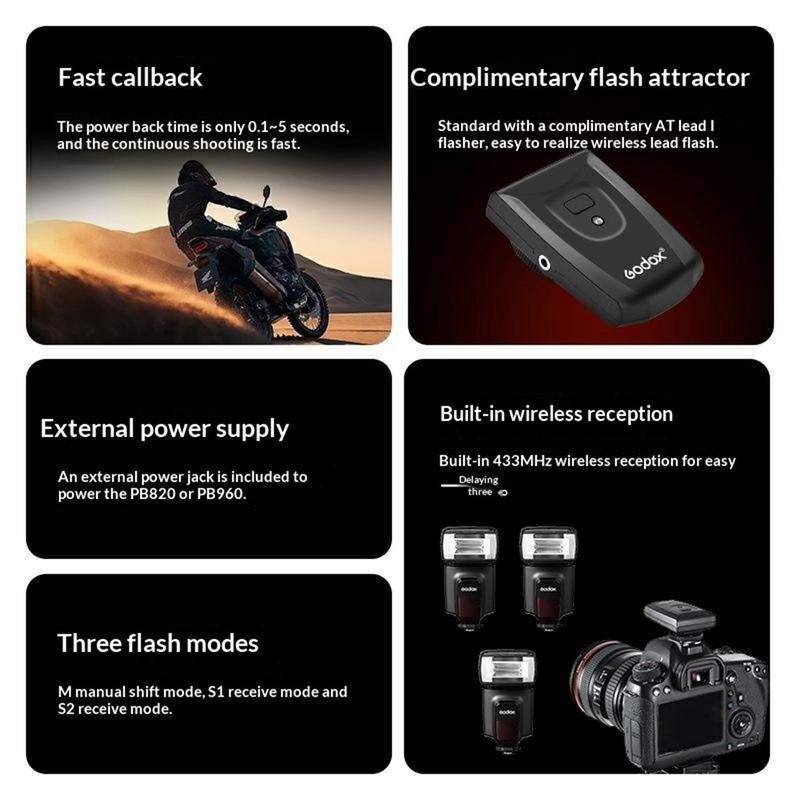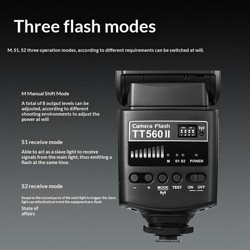 The GODOX TT560 II features built-in 433MHz wireless receiver support, allowing one-to-three off-camera flash triggering with 16 available channels and a transmission range of up to 15m. This makes it useful for portrait setups, product photography, creative indoor lighting, and other scenarios where more flexible flash placement is needed. Three flash modes are supported: Manual (M), optical slave (S1), and pre-flash ignore (S2), giving you more options for different lighting environments and shooting styles.