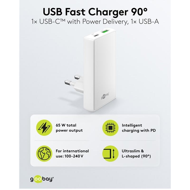 Goobay GaN Dual Fast Charger 90° Flat 65W - Ultra-Slim Wall Charger with USB-C & USB-A Ports