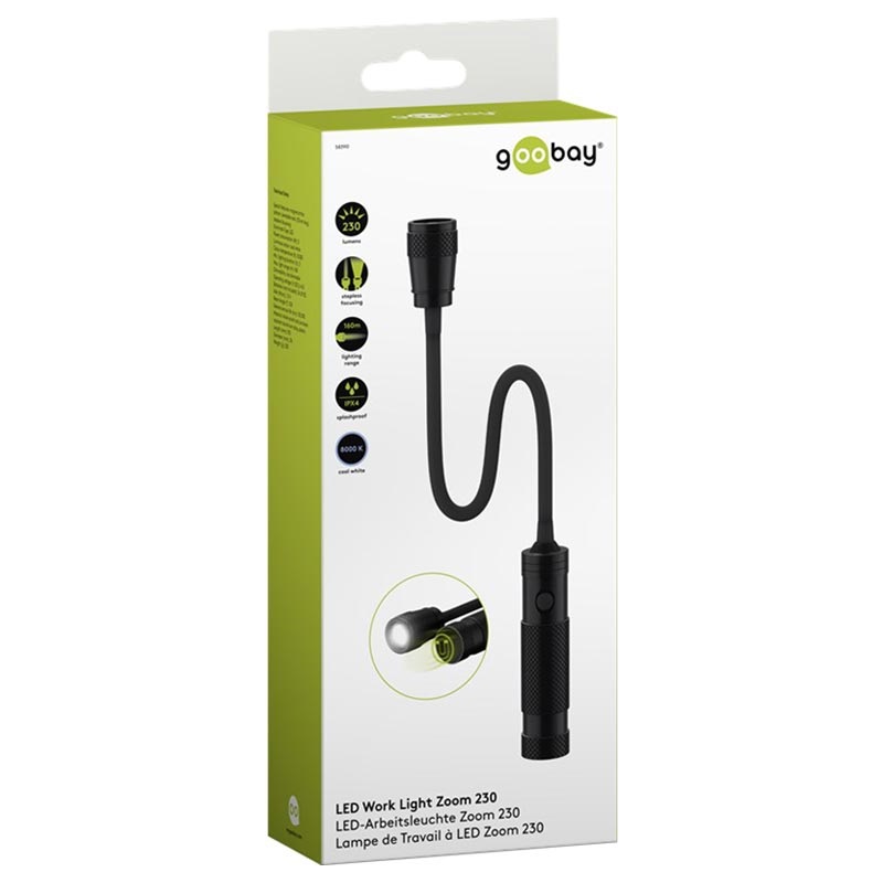 Goobay Zoom 230 LED pracovní světlo, vybavené magnetem na dně a 33 cm dlouhým flexibilním kabelem, je vhodným pomůcky, když potřebujete světlo a obě ruce zdarma. Upravte světelný kužel pomocí posuvného mechanismu pro efektivnější směrové světlo. Goobay Zoom 230 pracuje se třemi bateriemi LR03 AAA (není součástí).