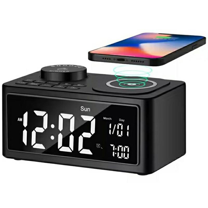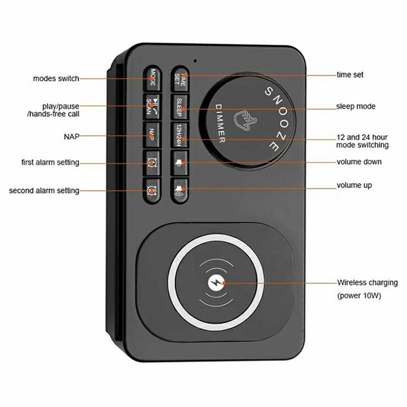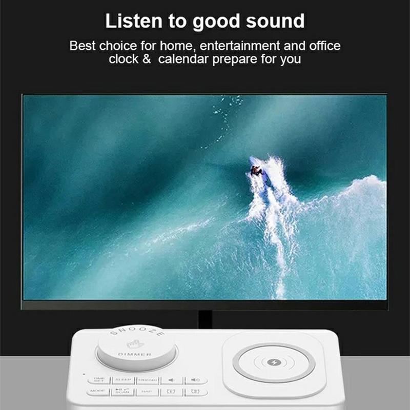Upgrade your bedside or workspace with the H7 Multifunctional Wireless Charging Bluetooth Speaker Clock Radio. This sleek, all-in-one device combines a wireless charger, Bluetooth speaker, FM radio, and smart alarm clock, offering convenience and efficiency in a compact design.