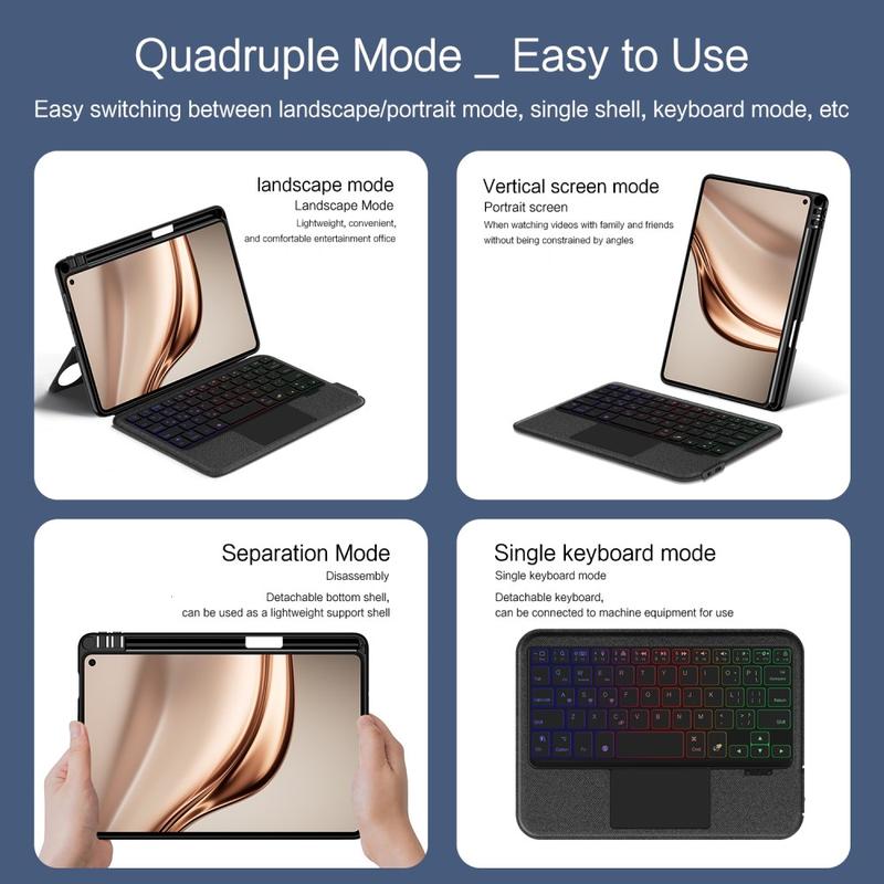 Enhance your Huawei MatePad Mini with the Bluetooth keyboard case, a multifunctional 2-in-1 accessory that combines protection, productivity, and style. Crafted from premium polyrethane, this sleek case provides full protection against scratches, shocks, and fingerprints while maintaining a professional look. The detachable Bluetooth keyboard connects wirelessly for smooth, responsive typing, while the integrated touchpad supports multi-gesture control for effortless navigation. Featuring a backlit keyboard, you can type comfortably even in low-light environments. The built-in adjustable stand offers an ergonomic viewing angle, making it perfect for typing, streaming, or reading. Designed for business, travel, or everyday use, this keyboard case transforms your tablet into a portable workstation.