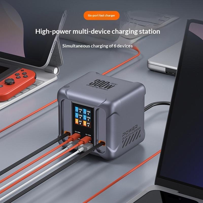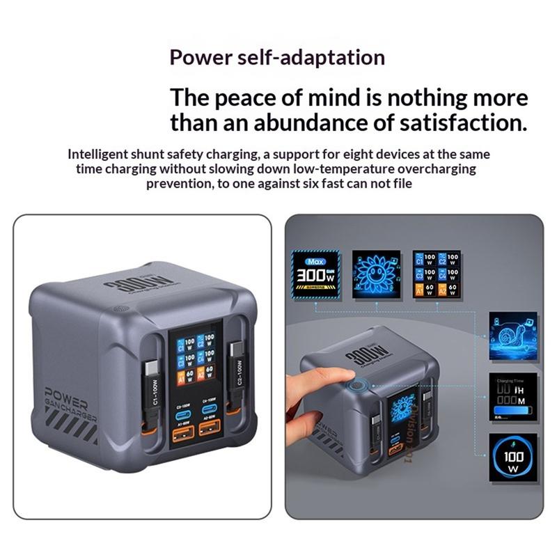 HW866 300W GaN Desktop Charging Station with LCD Display - 6-Port Charger with 2 Retractable USB-C Cables, EU Plug