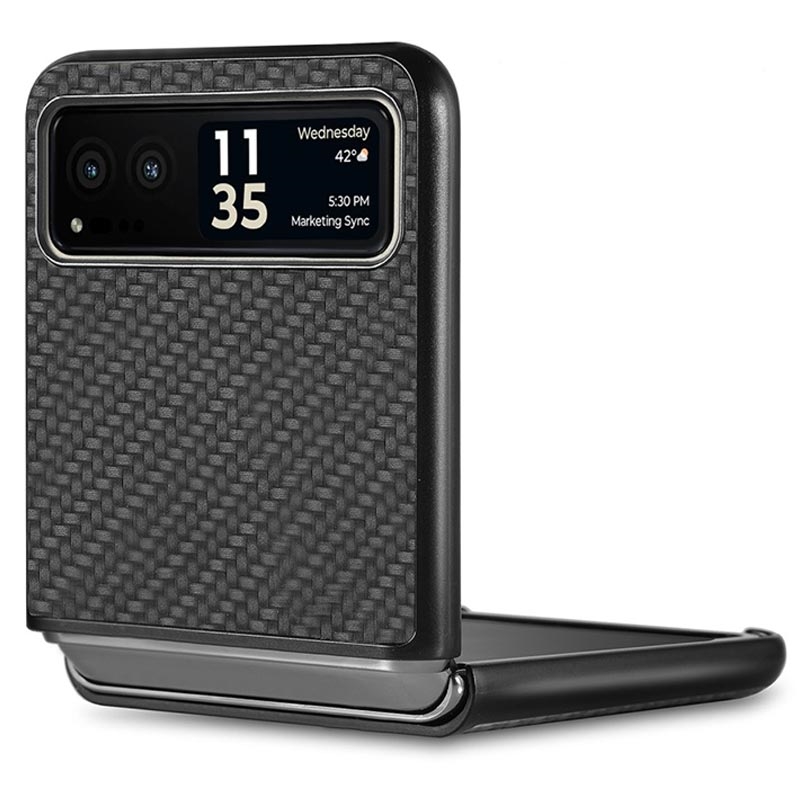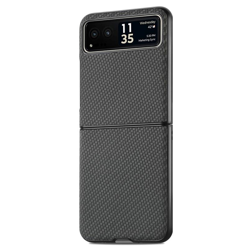 Tento tenký odolný kryt je vyroben z plastický, překrytý jemným polyuretanem s texturou z uhlíkových vláken, která zlepšuje úchop a příjemný pocit z ruky. Přesto je pouzdro lehké a tenké a váš Motorola Razr 40 zůstává funkční jako obvykle.