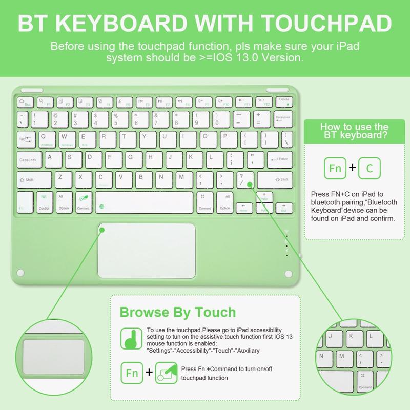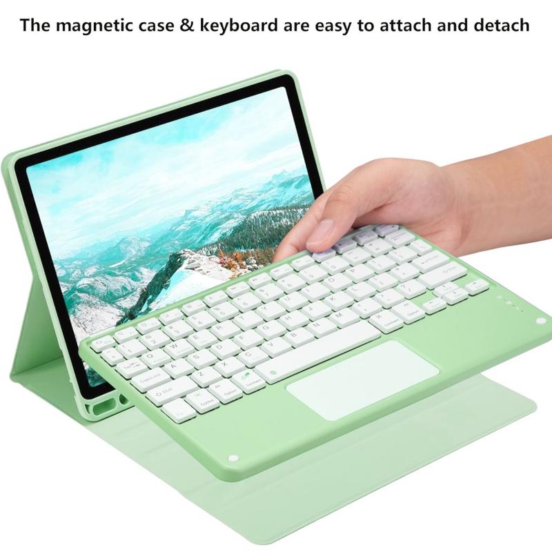 Enhance your iPad Air 11 2026/2025/2024, iPad Air 2022/2020 with the Bluetooth keyboard case, a multifunctional 2-in-1 accessory that combines protection, productivity, and style. Crafted from premium polyrethane, this sleek case provides full protection against scratches, shocks, and fingerprints while maintaining a professional look. The Bluetooth keyboard connects wirelessly for smooth, responsive typing, while the integrated touchpad supports multi-gesture control for effortless navigation. Featuring a backlit keyboard, you can type comfortably even in low-light environments. The built-in adjustable stand offers an ergonomic viewing angle, making it perfect for typing, streaming, or reading. Designed for business, travel, or everyday use, this keyboard case transforms your tablet into a portable workstation.