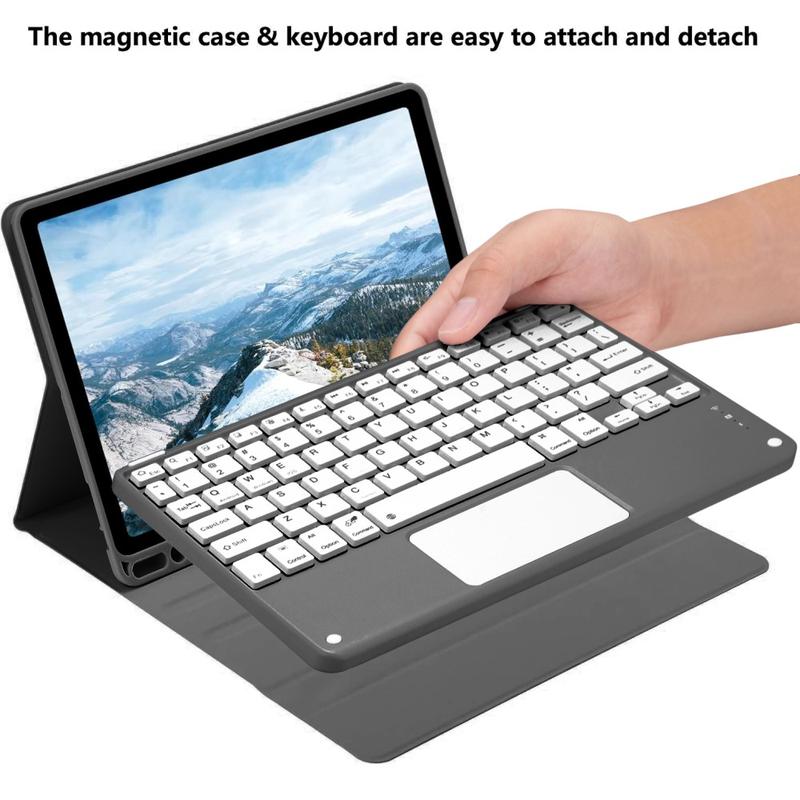 Enhance your iPad Air 11 2026/2025/2024, iPad Air 2022/2020 with the Bluetooth keyboard case, a multifunctional 2-in-1 accessory that combines protection, productivity, and style. Crafted from premium polyrethane, this sleek case provides full protection against scratches, shocks, and fingerprints while maintaining a professional look. The Bluetooth keyboard connects wirelessly for smooth, responsive typing, while the integrated touchpad supports multi-gesture control for effortless navigation. Featuring a backlit keyboard, you can type comfortably even in low-light environments. The built-in adjustable stand offers an ergonomic viewing angle, making it perfect for typing, streaming, or reading. Designed for business, travel, or everyday use, this keyboard case transforms your tablet into a portable workstation.