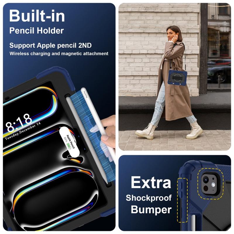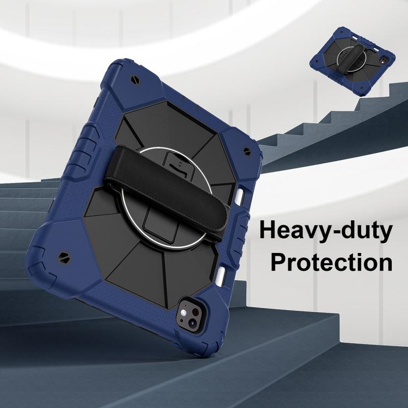 Chraňte svůj iPad Pro 11 (2024), iPad Pro 11 (2025) před každodenním poškozením s tímto fantastickým pouzdrem Heavy Duty 360! Toto módní pouzdro s vnitřní protiskluzovou podšívkou a integrovaným otočným stojánkem umožňuje prohlížení na šířku nebo na výšku bez použití rukou. Rám a vnitřní skořepina jsou vyrobeny z plastu a vnější povrch z měkkého silikonu. Tato kombinace poskytuje vynikající ochranu proti pádu nebo poškození. Oblíbené a ochranné, toto hybridní pouzdro je perfektním krytem pro váš iPad Pro 11 (2024), iPad Pro 11 (2025).