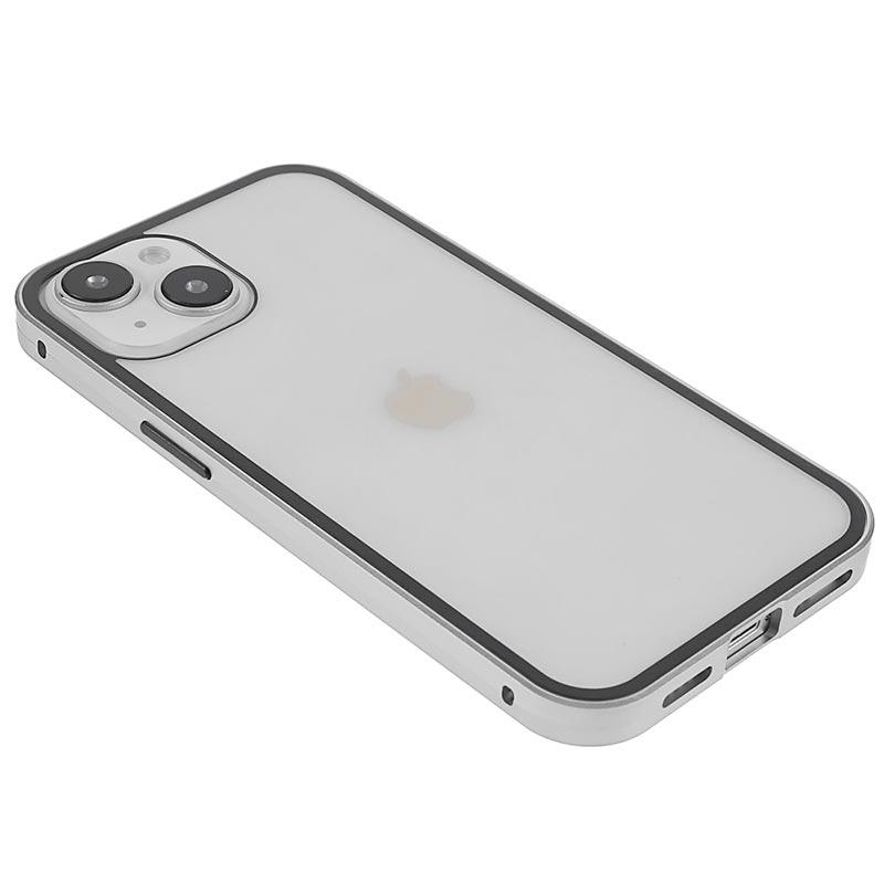 - iPhone 14 case with a metal frame and tempered glass for back and front