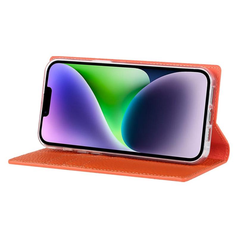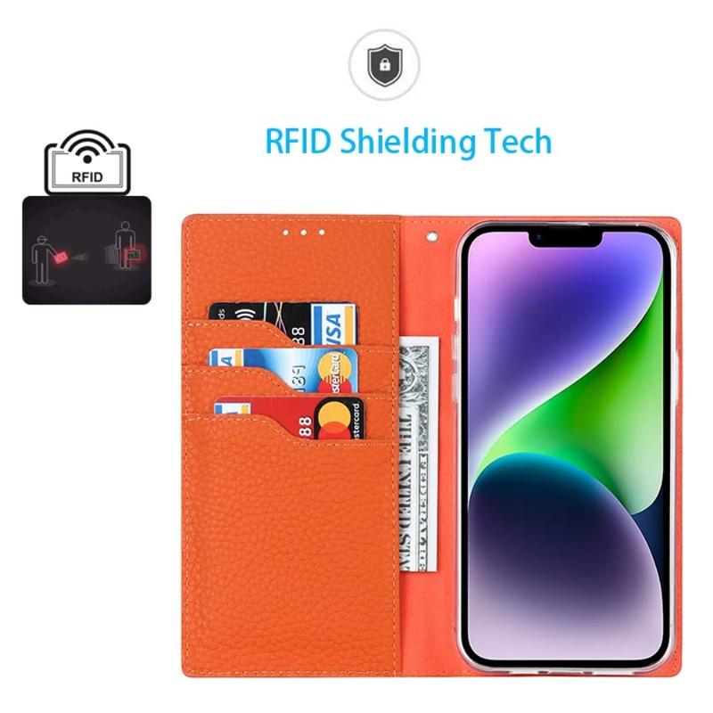 Pro iPhone 14 Slot blokovací karty RFID Peněženka Pouzdro na telefon Litchi Textura z pravé kůže Stojan s automatickým vstřebáváním Ochranný kryt