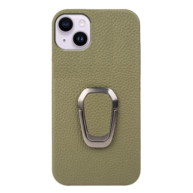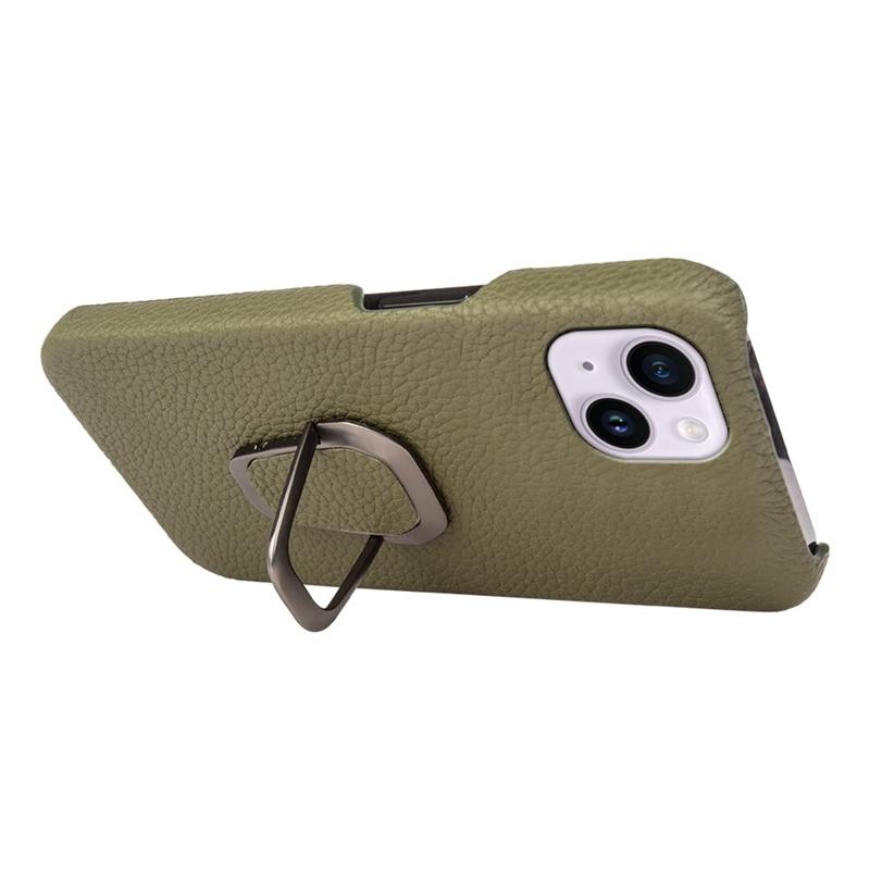 Pro iPhone 14 Plus Originální kůže potažená PC Ochranný kryt telefonu Držák kroužku Stojánek Design Litchi Textura Protiskluzové pouzdro odolné proti nárazům