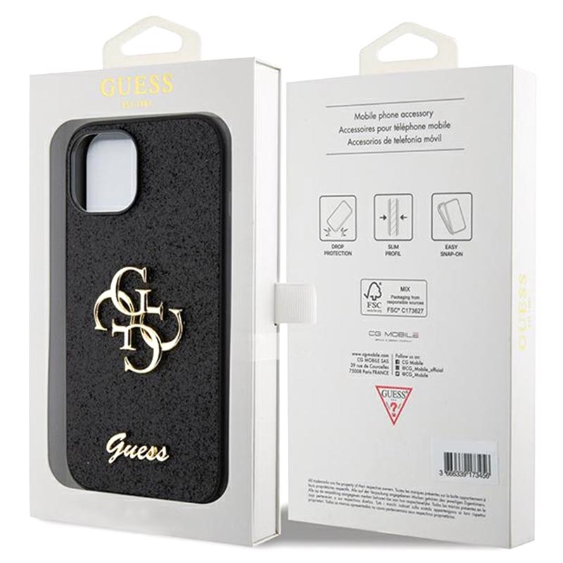 - Spectacular Guess Fixed Glitter 4G Metal Logo cover for iPhone 15
